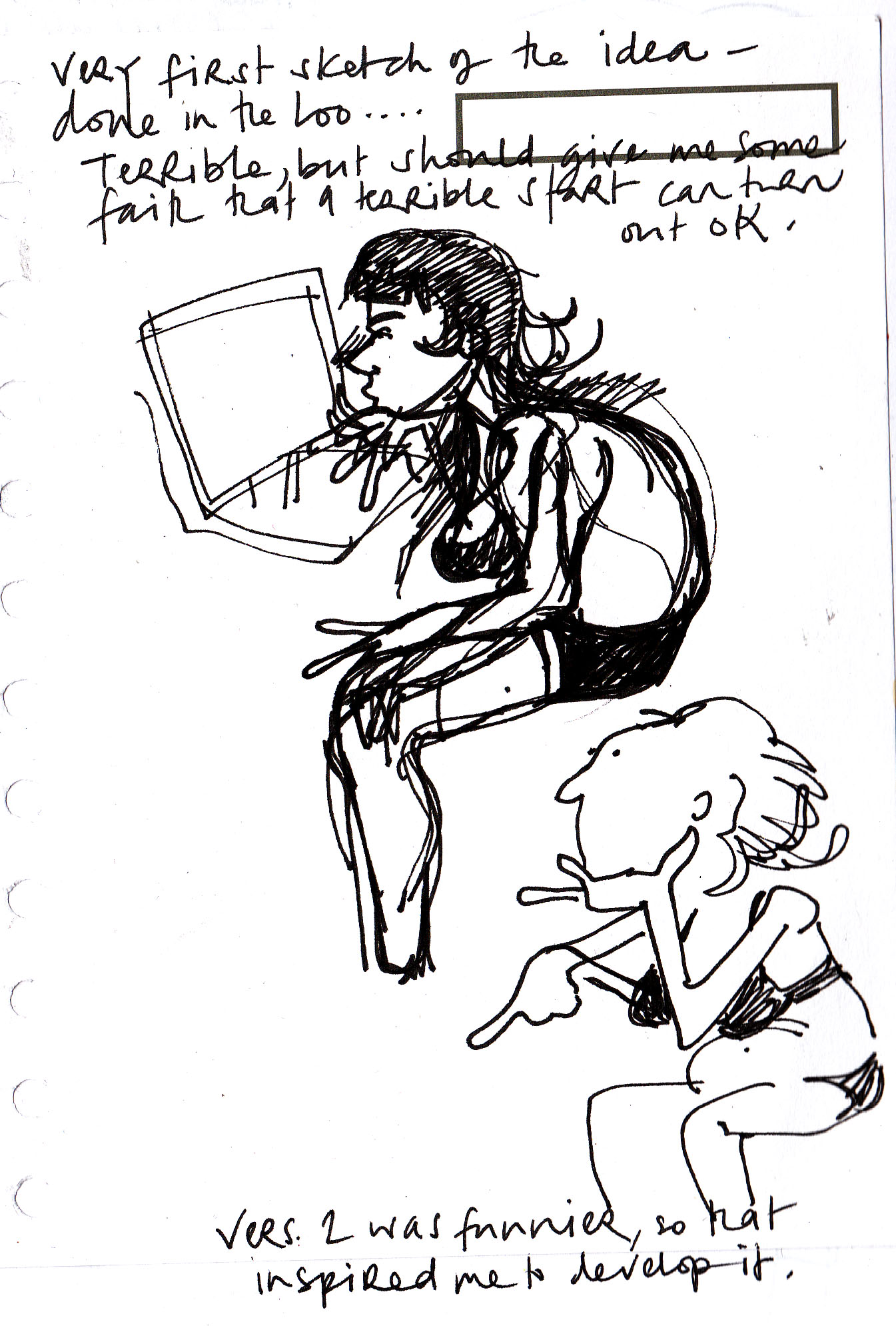 Besides clarifying that I am not really a careless mother with her head in a laptop (well, not always), I thought I’d post a few images of how that drawing happened. I mean, the process of drawing it – not the idea. Because it might be the drawing process itself that will change whilst I study on the MA; so why not expose that, examine it? My instinct is to hide those few, terrible, first sketches. This would help to encourage the idea that I am a Mozart-like genius who produces ‘perfect’, uncorrected drawings on the first attempt (actually I would still perfect the sketch yet). Instead I am going to show all the awful messes that led up to the drawing I published on the ‘Why Blog?’.