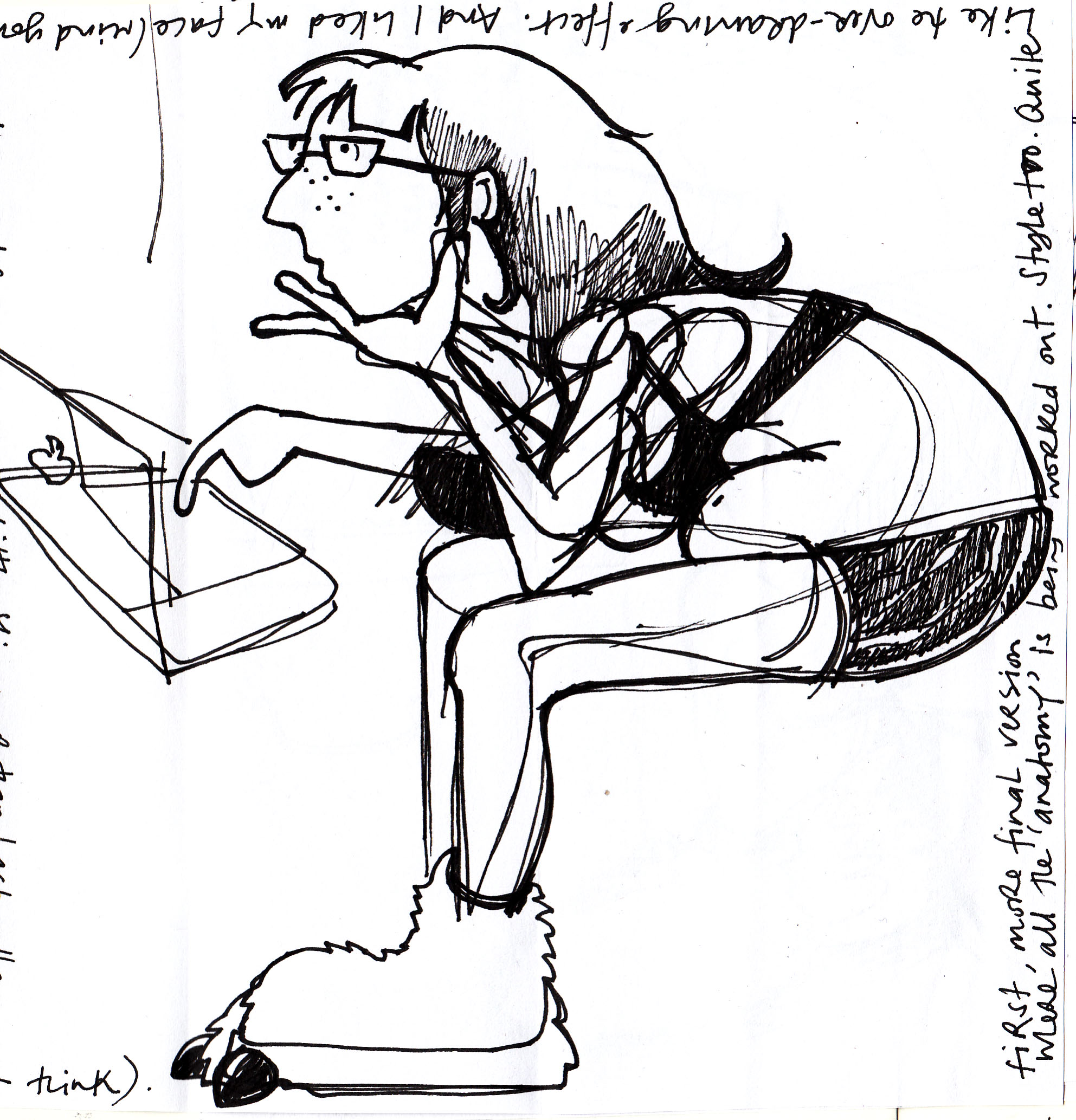 I ought to just briefly mention that the inspiration for drawing myself blogging (one-finger typing) in my underwear comes from a book I have considered purchasing, called “Freedom is Blogging in your Underwear” by Hugh Macleod.