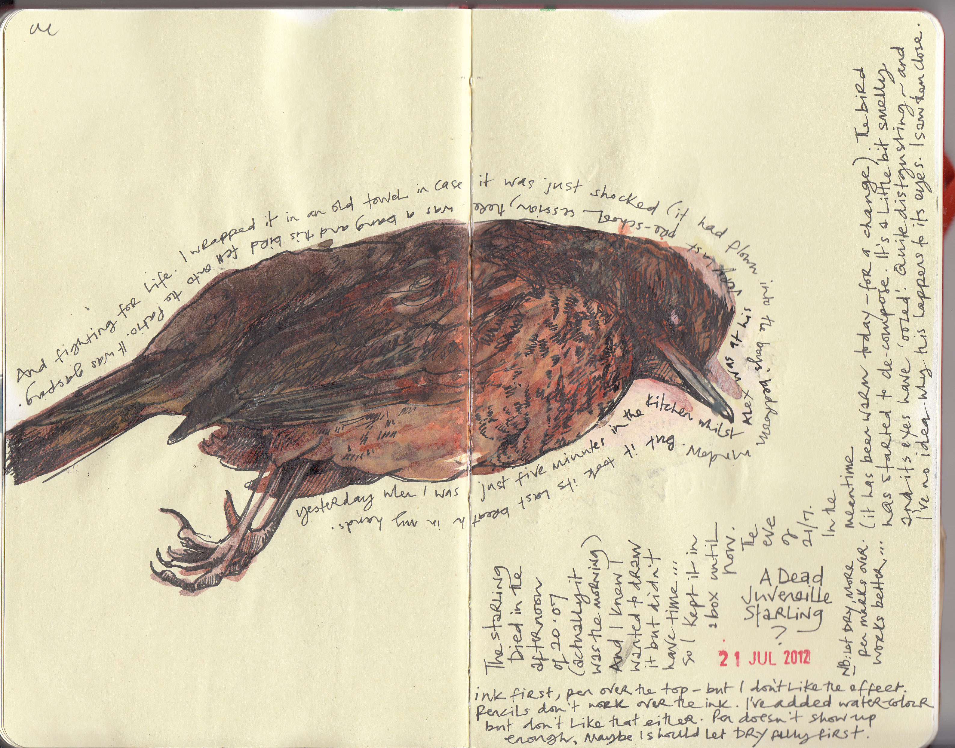 Country Diary of an Edwardian Lady Posted byNatalie EldredSeptember 15, 2013September 18, 2013Posted inBack Catalogue, ObservationalTags:Dead things, Drawing, Sketchbook 2011-2013 ….mighty oaks do grow (from such as these). Natural subjects. What’s wrong? They’re not all dead. (Actually I think the juvenile starling might actually be a thrush). Share this: Click to share on X (Opens in new window) X Click to share on Facebook (Opens in new window) Facebook Like Loading... Related
