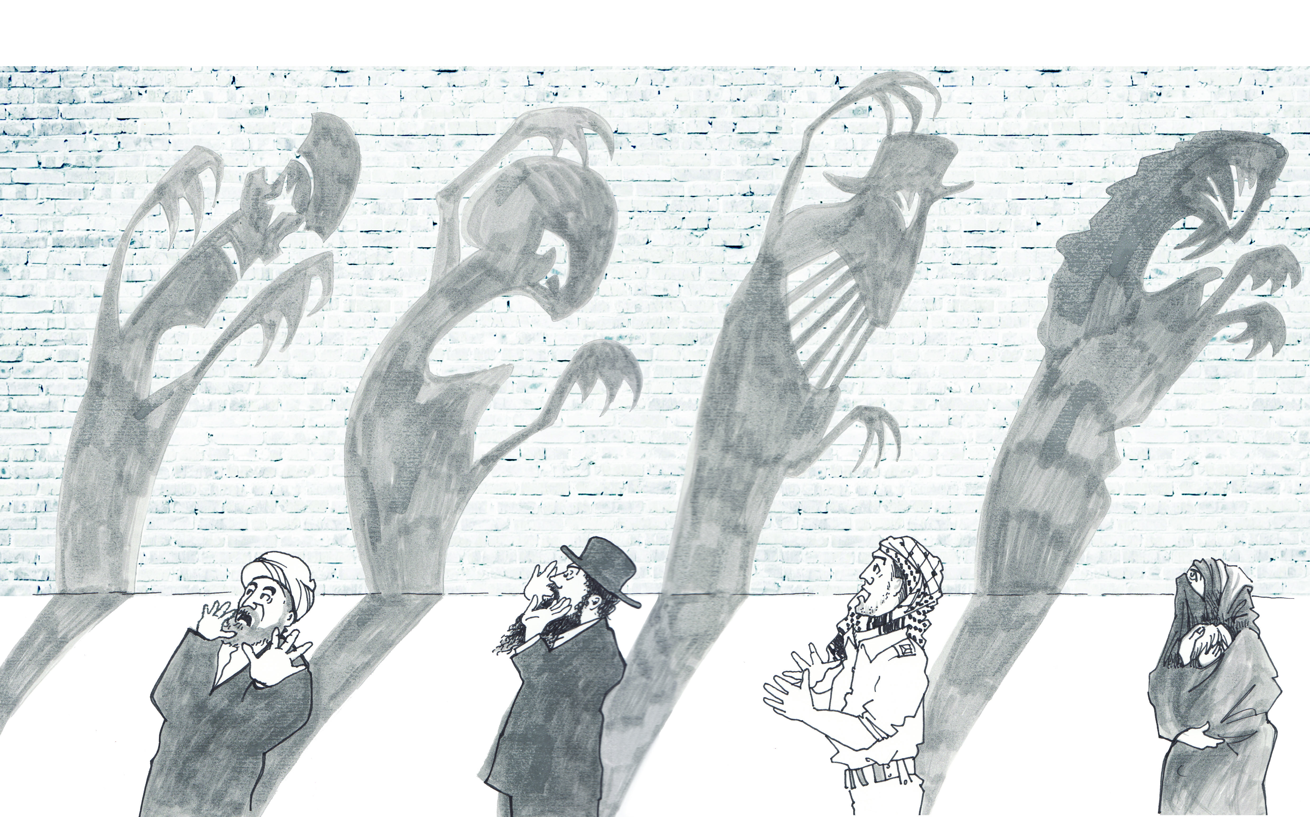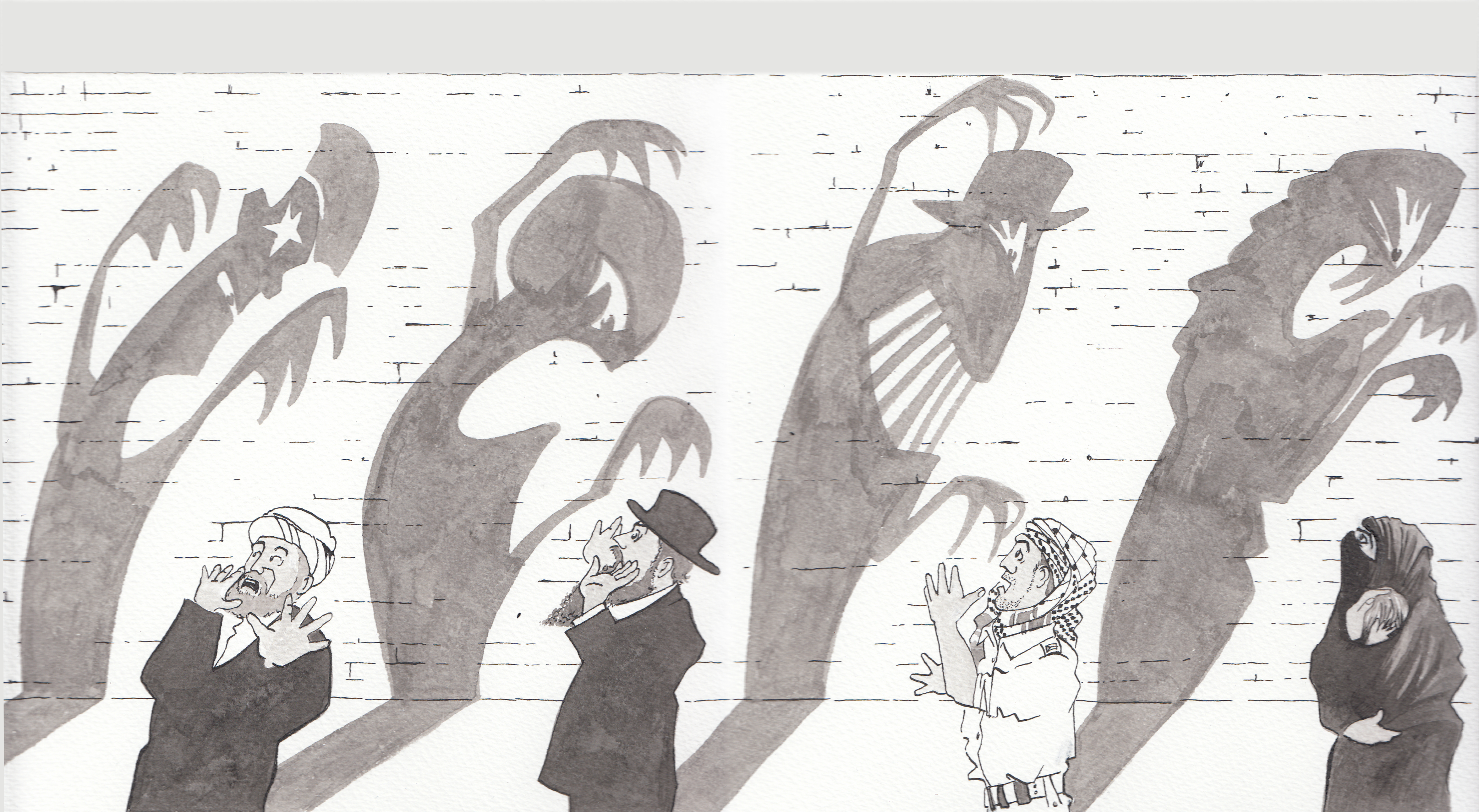 Good ‘scared-ness’ I think, but Sam tells me they’re in the wrong order. The Palestinian should be after the Israeli. “Oh”, I reply (via e-mail) “that is the ‘Muslim world’ (represented by the Arab figure) not the Palestinian”. Sam suggests a different look for the figure representing the Muslim world. I draw this: