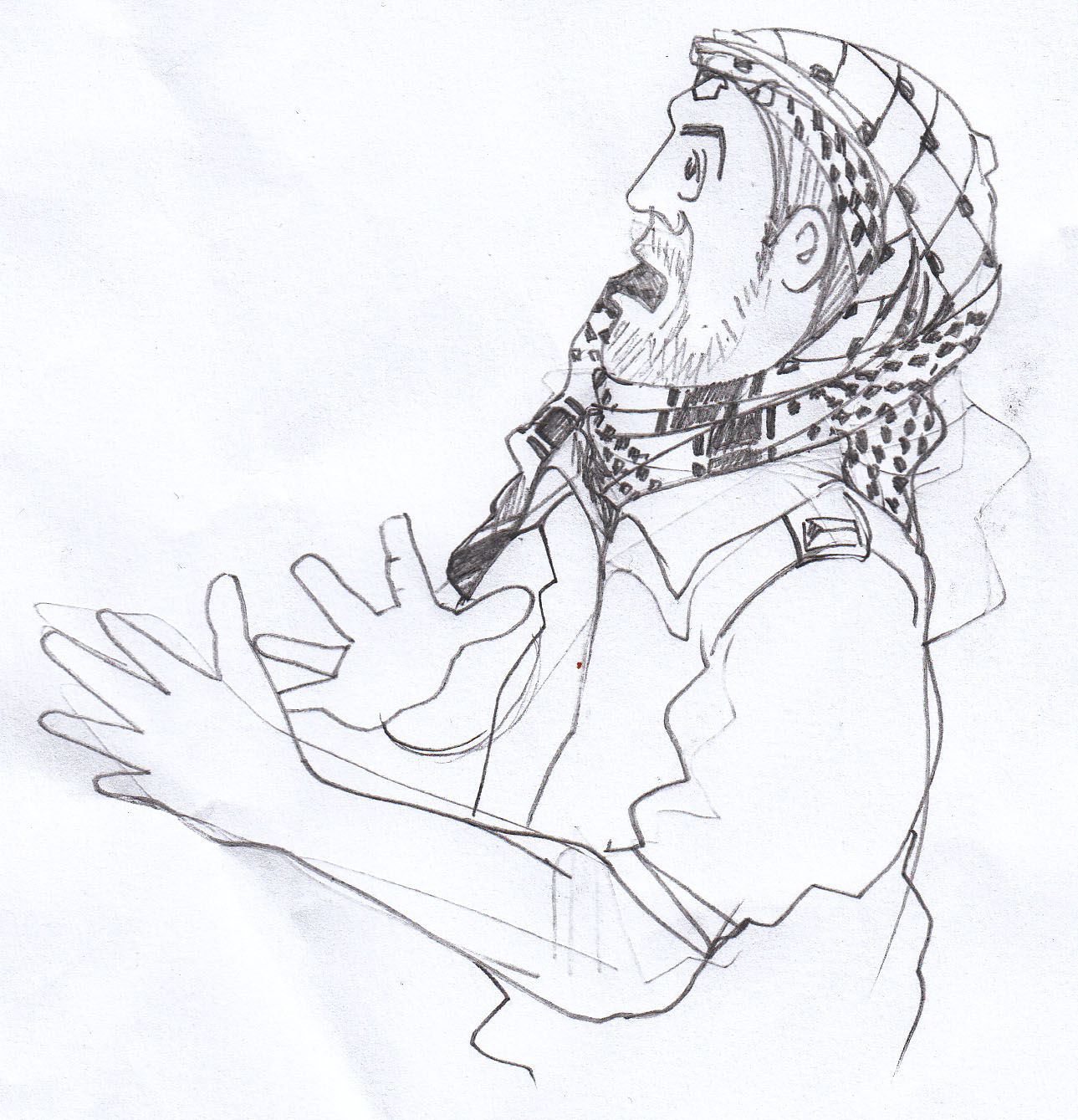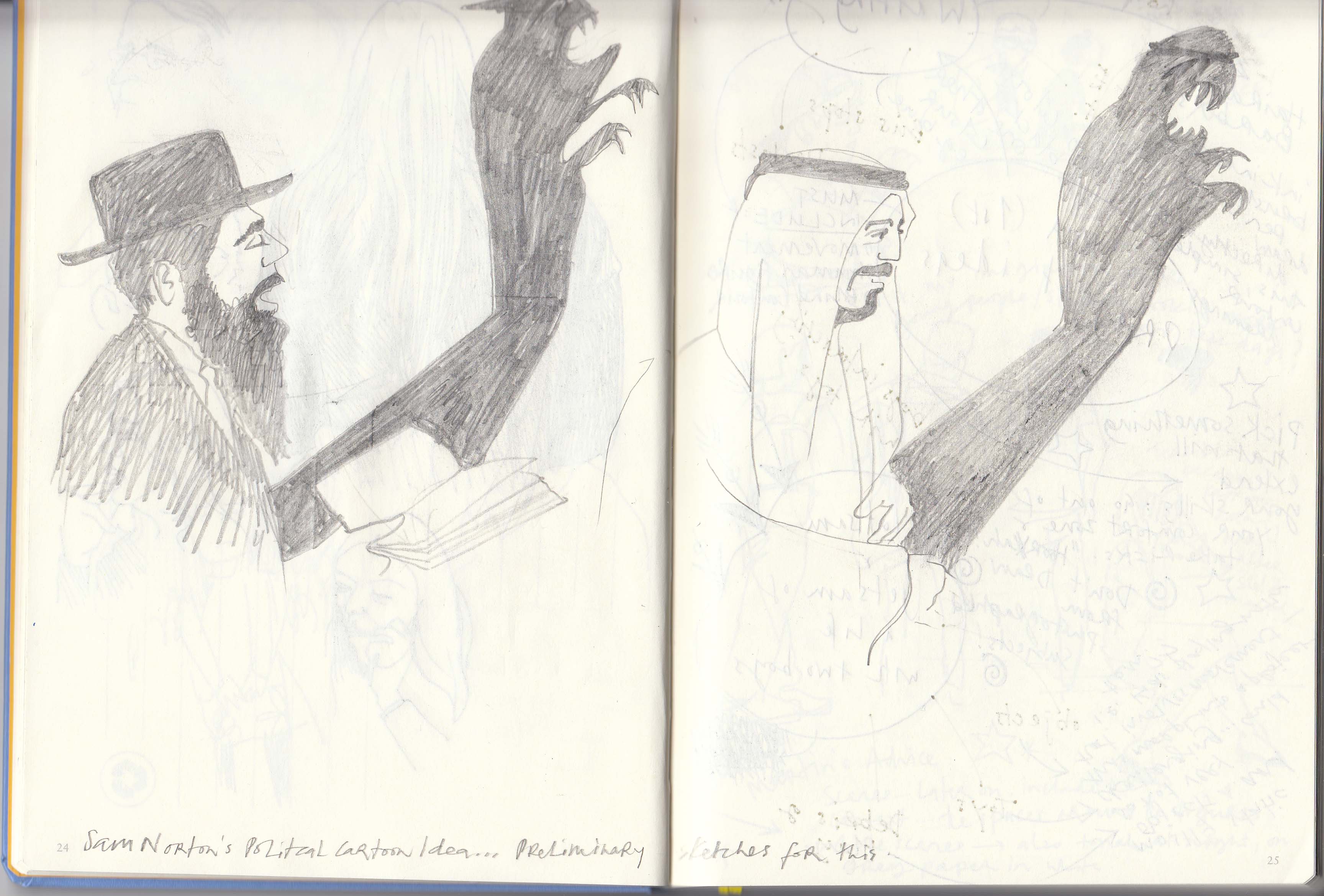 At this point I am not happy with the Arab character representing the Palestinian. I can see, that to most people, the way I’ve drawn the Arab here would just represent ‘Sheik/United Arab Emirates/Yemeni oil millionaire/Saudi Prince’ or something, I wanted something more obviously Palestinian. Hence this: