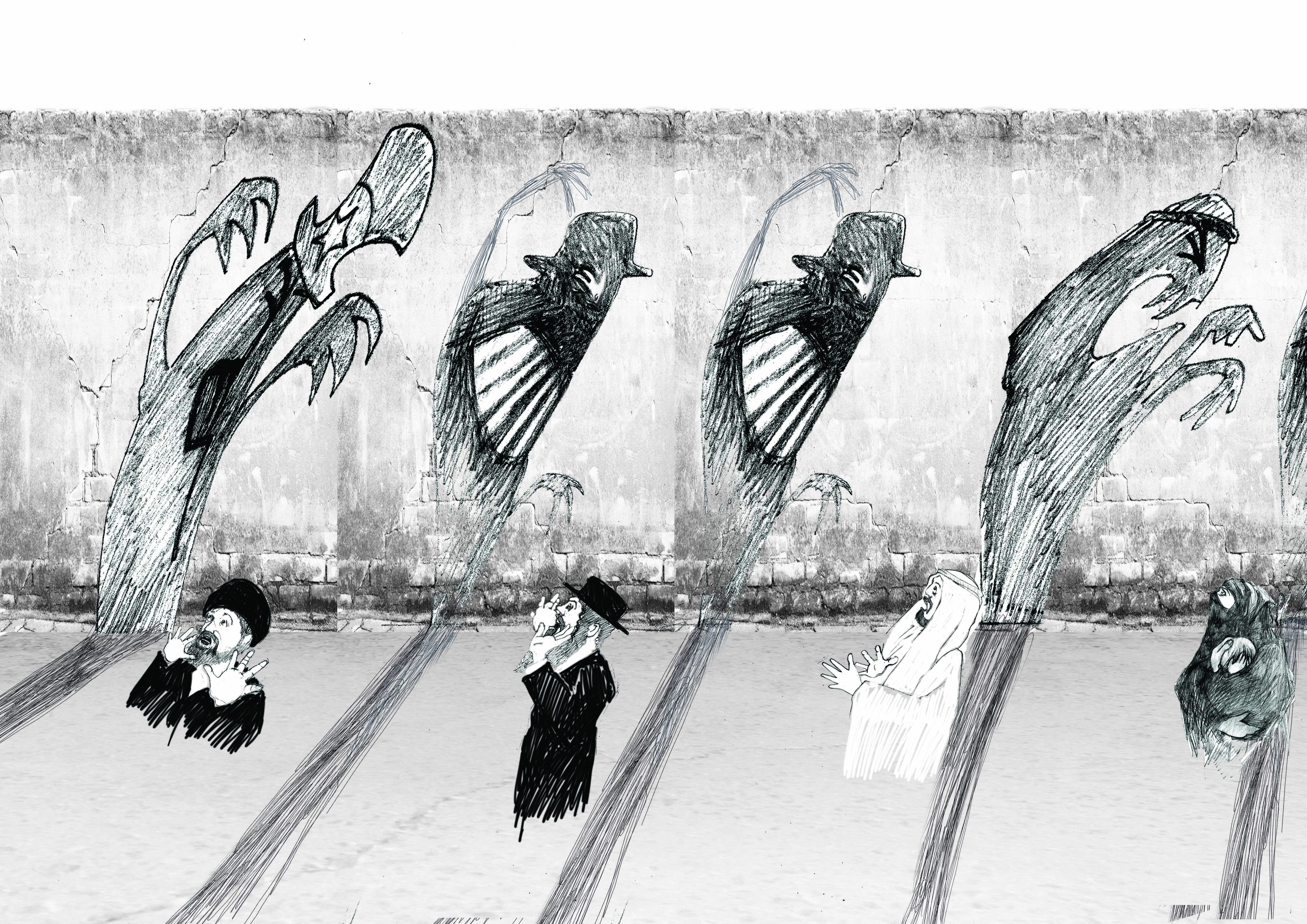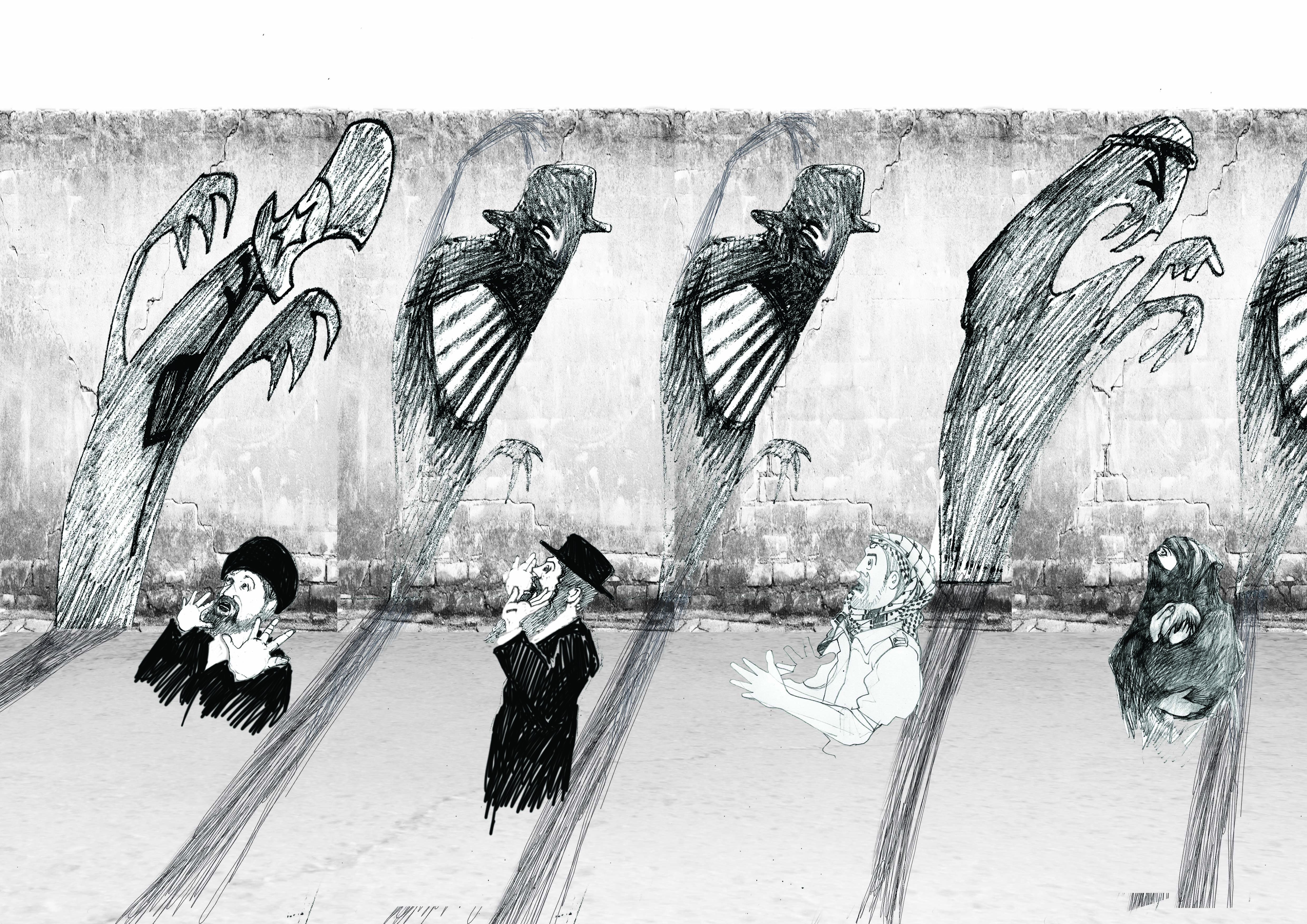 So, below is the final image. As well as raising the figures to have a closer relationship to the shadows, there has been a slight change of hand position with our Palestinian and the wall is hand-drawn now.