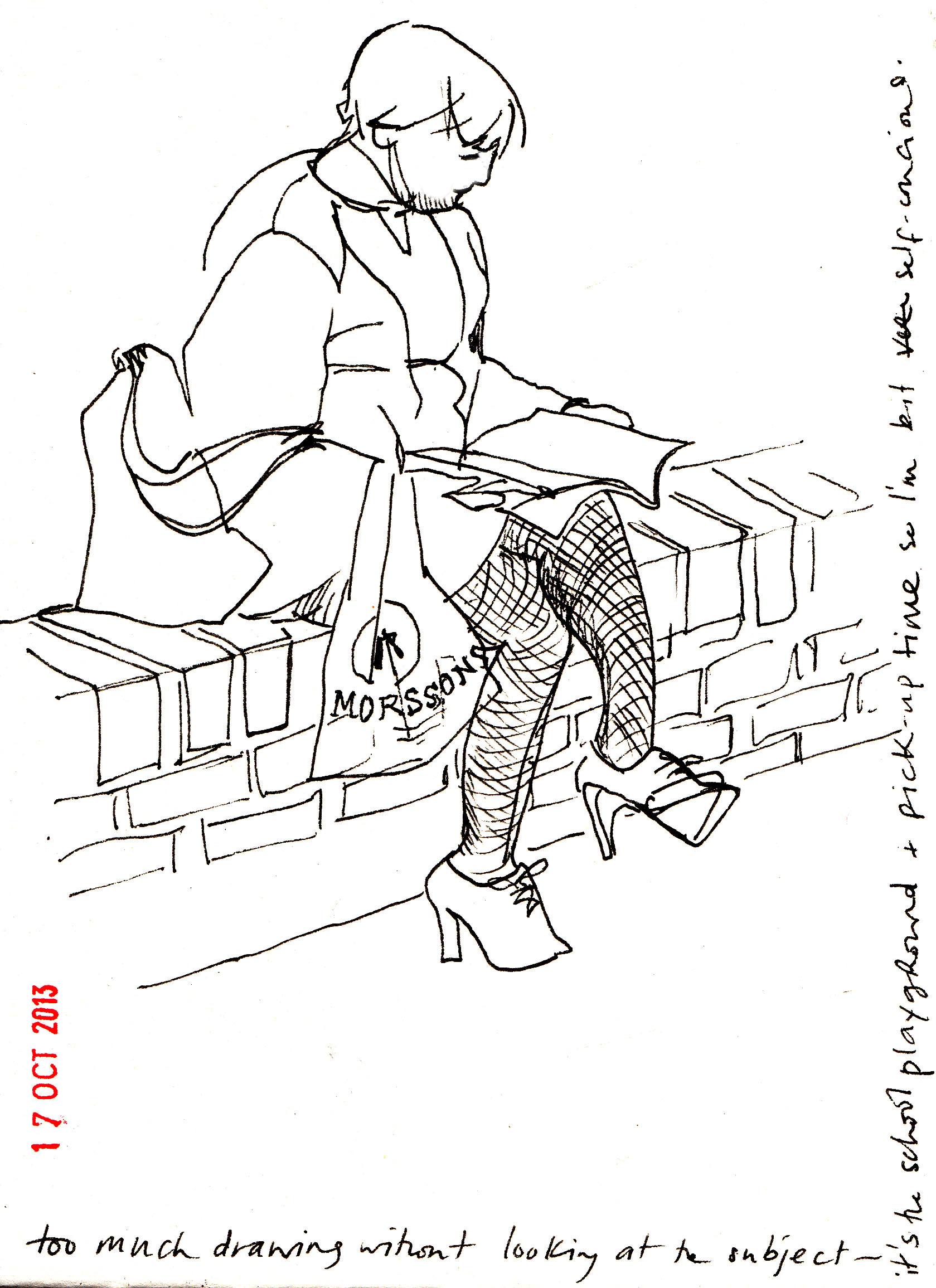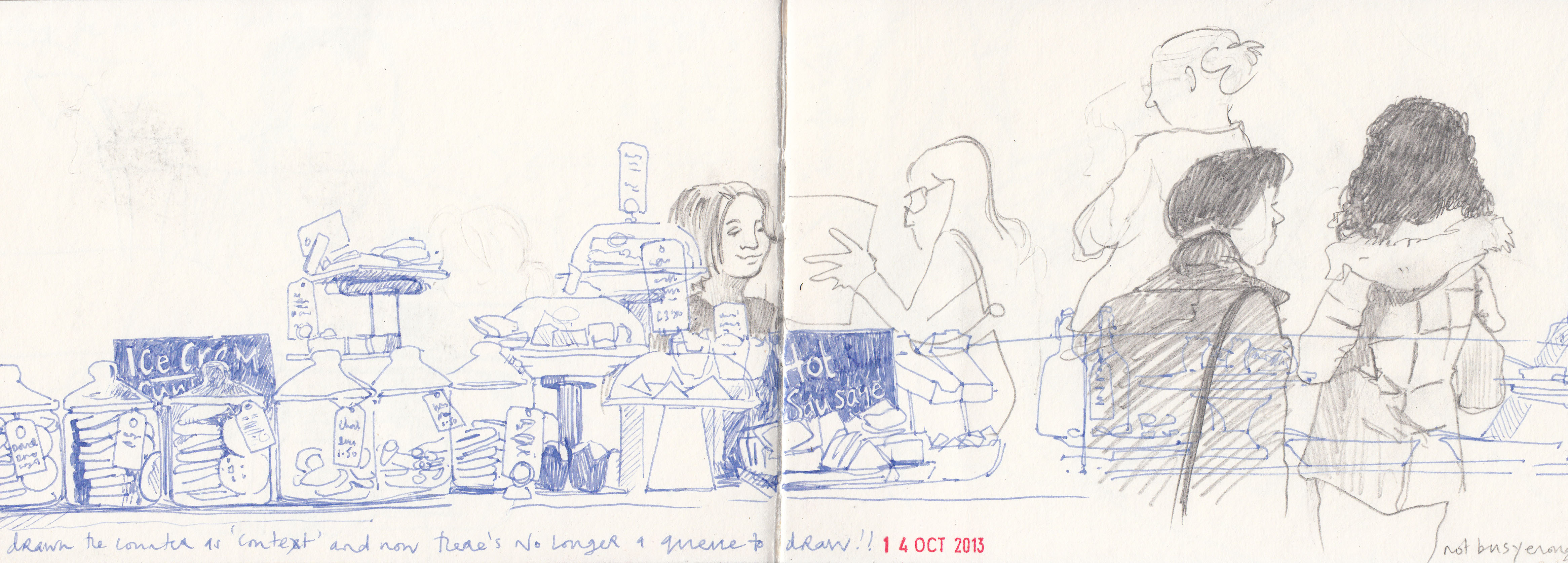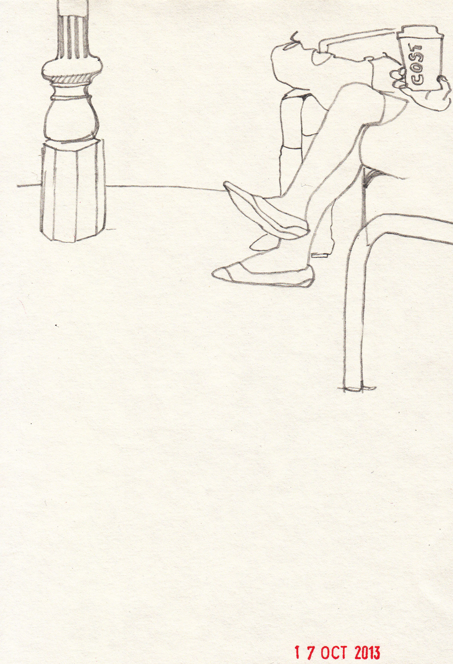 Today I went out and managed just one sustained drawing in Liverpool street station – I wanted to draw above the main concourse. I hated the drawing at the time – the materials didn’t work together as planned because I think I bought the wrong kind of white paint-pen. However, I did manage to grapple with ‘framing’ the drawing, planning it’s composition and giving consideration to what I wanted to get on the page. I haven’t done this in a long, long time (maybe ever?). I even did some measuring, grappled with perspective (I say ‘grappled’ deliberately).