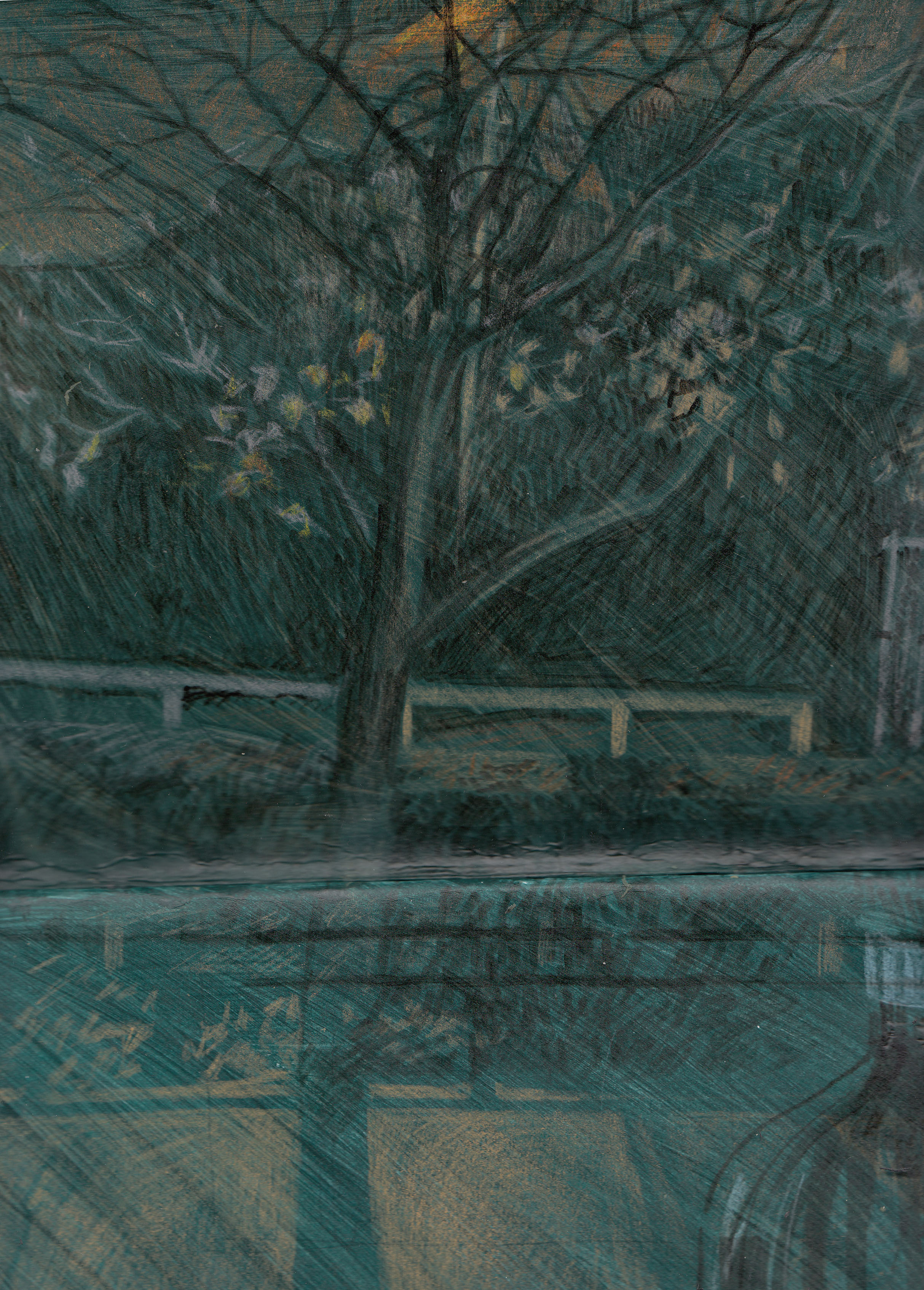 Oh just one more, drawn out of my window at night. It is necessary to shine a torch on the drawing as you draw, so that I can still see out of the window. Nice to draw at night though, strange colours. First time I’ve really enjoyed using colour maybe… I definitely have more confidence with colour since the workshop with Jane Human. The actual image is a little bigger – this is all that can fit on my scanner.