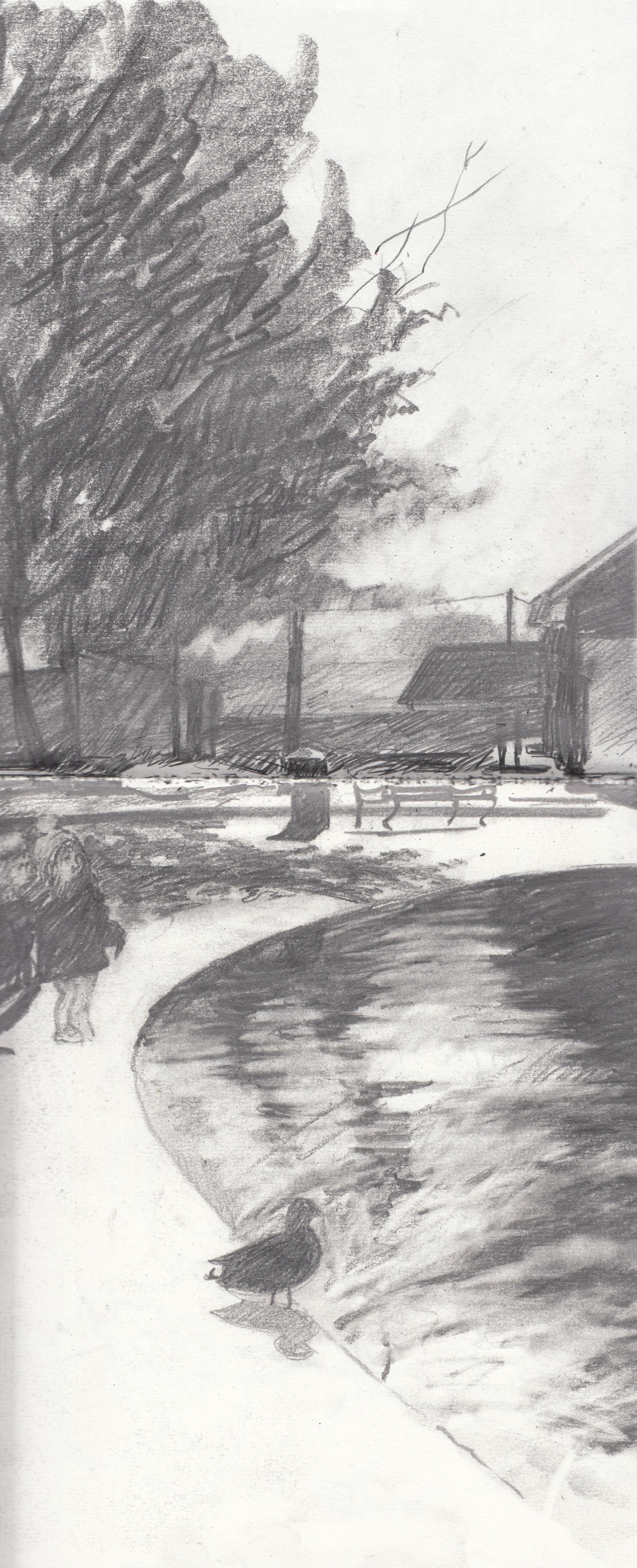 I went out to draw at Writtle duck pond. I hoped to get the opportunity to draw people, children and their adults especially, and ducks. I sort of got to do that, but it was cold. And you can tell – which just goes to show how the truth comes out through drawing. You can tell if an artist has enjoyed making a drawing, or if it’s laboured and forced, or if they were simply bored. This one was a tense struggle to capture the light, and the cold came out in it too!