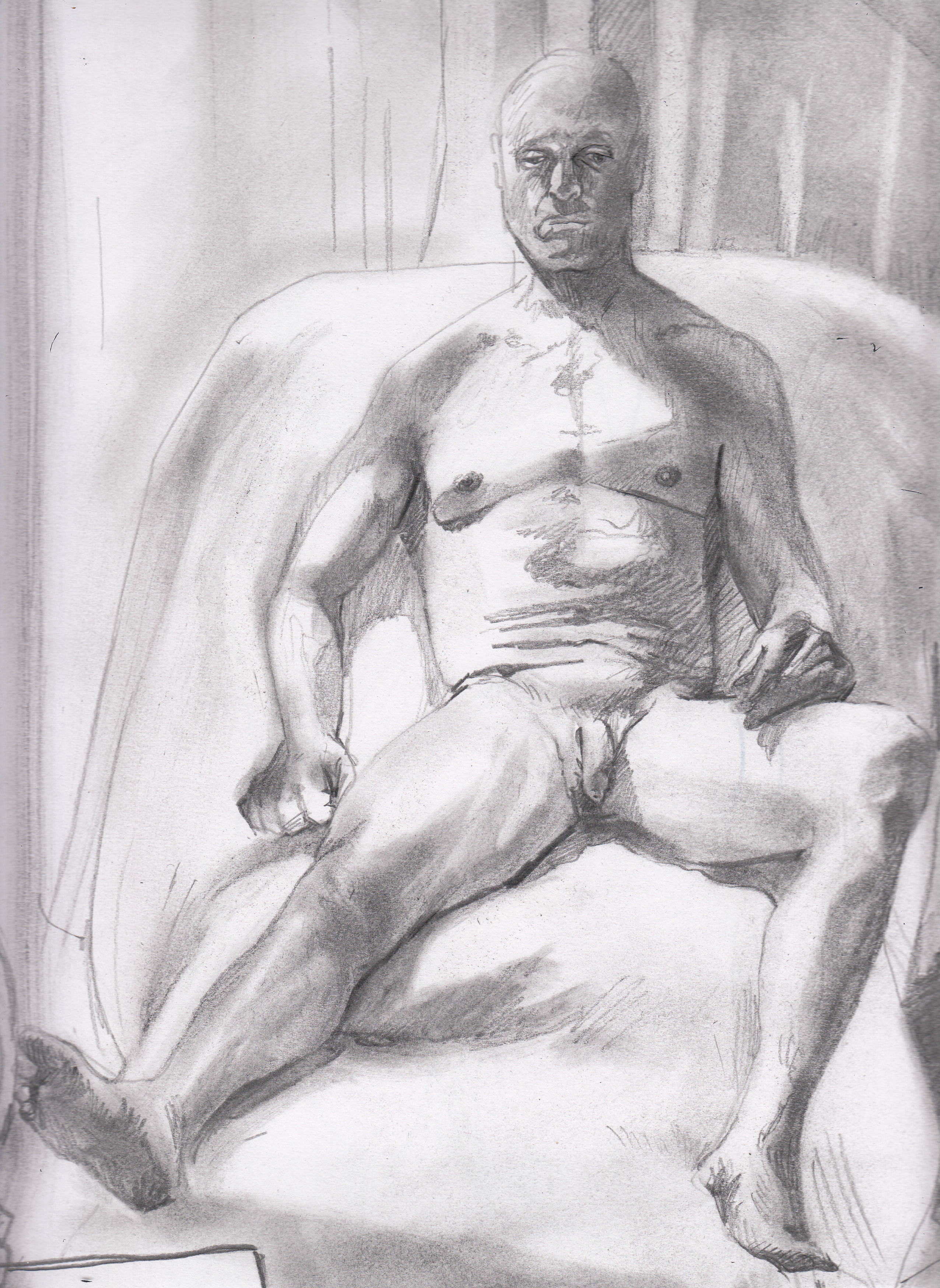 Overall I like the result although I think I could have worked more loosely. Perhaps I should have used charcoal on sugar paper – with some white chalk or paint.. so that’s an idea for next time I go. The thing I really love though, and absolutely love, is his leg – the model’s right leg to be specific – it has come out so 3D. I feel I wouldn’t be too embarrassed to show that to Leonardo Da Vinci – I’m sure he’d find it wanting, however.