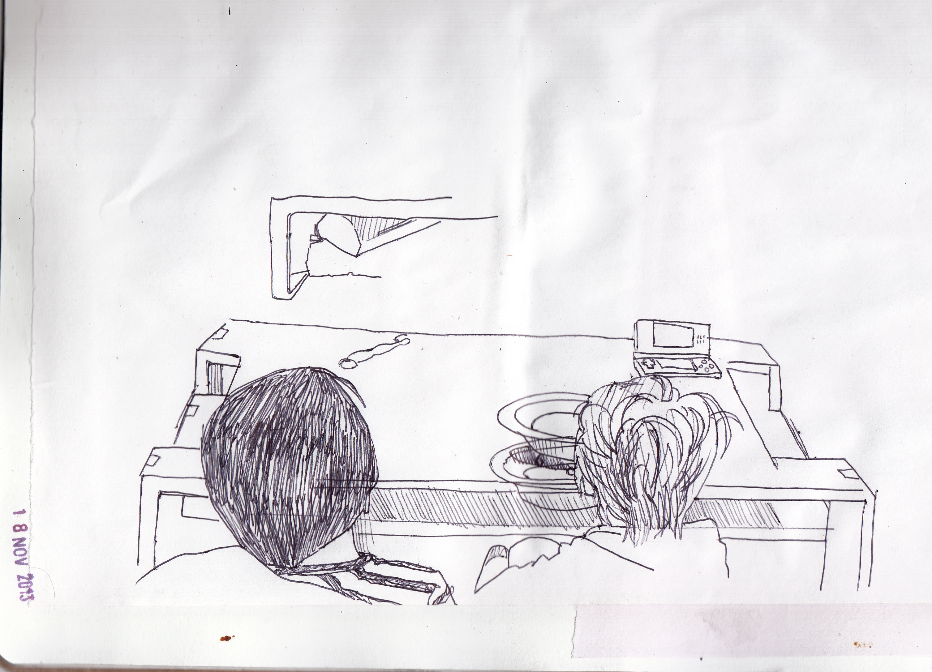 I drew this with a dip pen, in situ and used acrylic to paint and draw almost at the same time. Of course the coffee table is skew-wiff and Sam, my son, is all out-of-proportion but that’s all fine because there was something instantly likeable about this for me. Maybe it was the white space, the use of colour (I paid heed to the things taught in Jane Human’s colour workshop), maybe the speed… not sure. But there is definitely something here that I love – now what is it? What is that elusive ‘thing’? And why is it not in every drawing that I do?