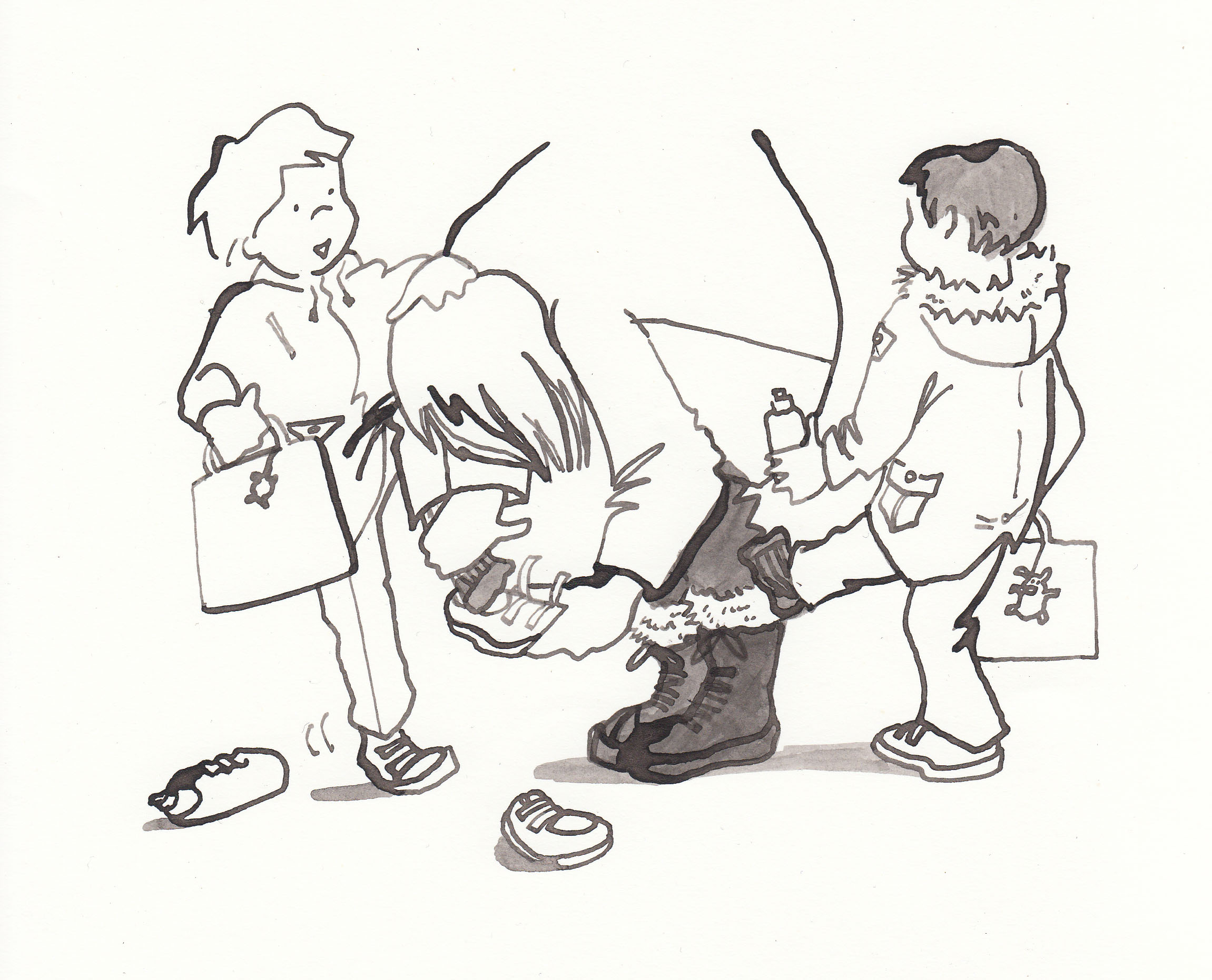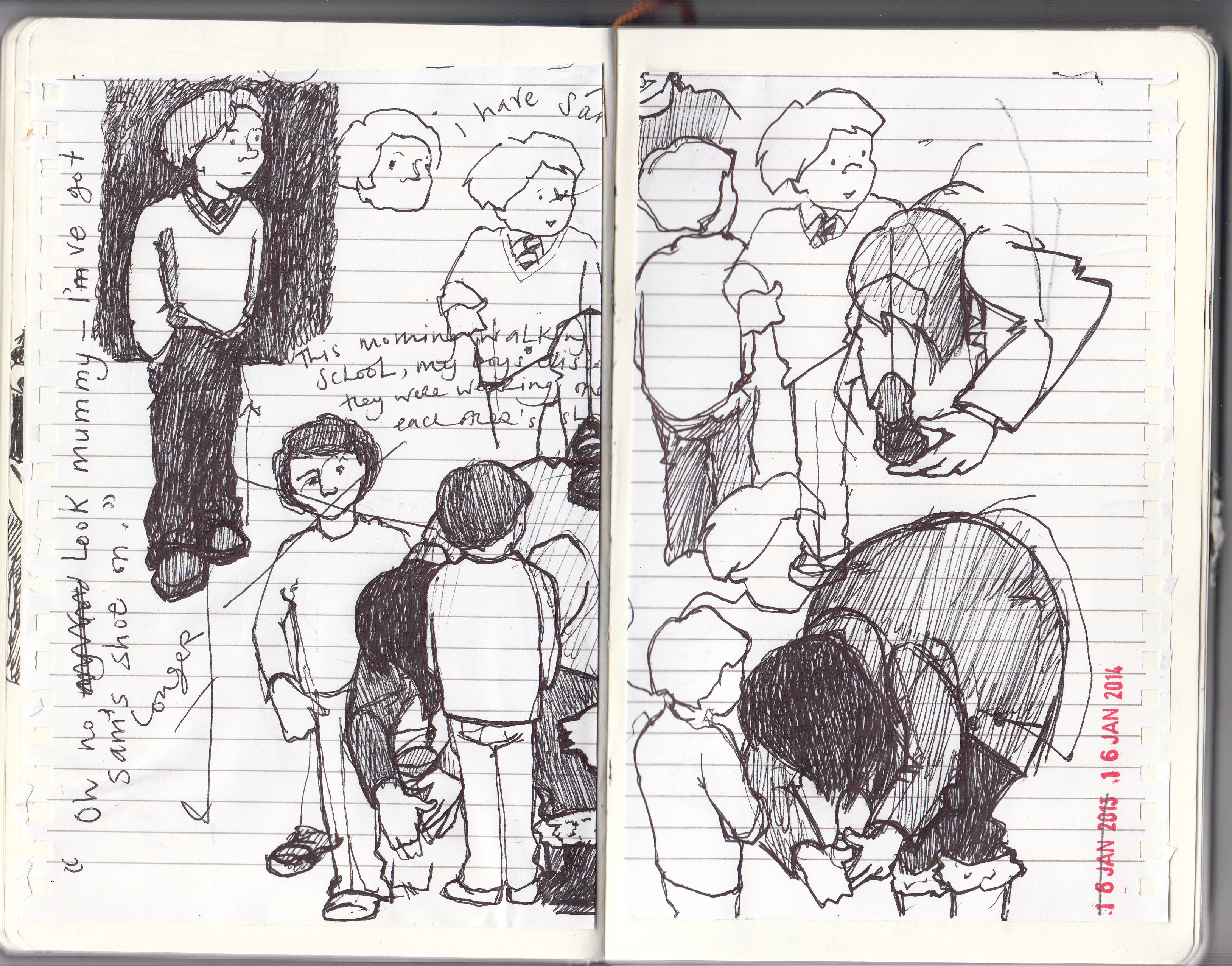 Inspired a little by ‘DoodleMum’, I have drawn a scene from ‘my life as a mum’. My two boys are only 16 months apart in age, and many friends have told me that I should draw some of the scenes from (the wreck of) my life, one even suggesting a title: ‘two under two’. Although now they’re both at school aged 5 and 6, I will need to think of a new title.