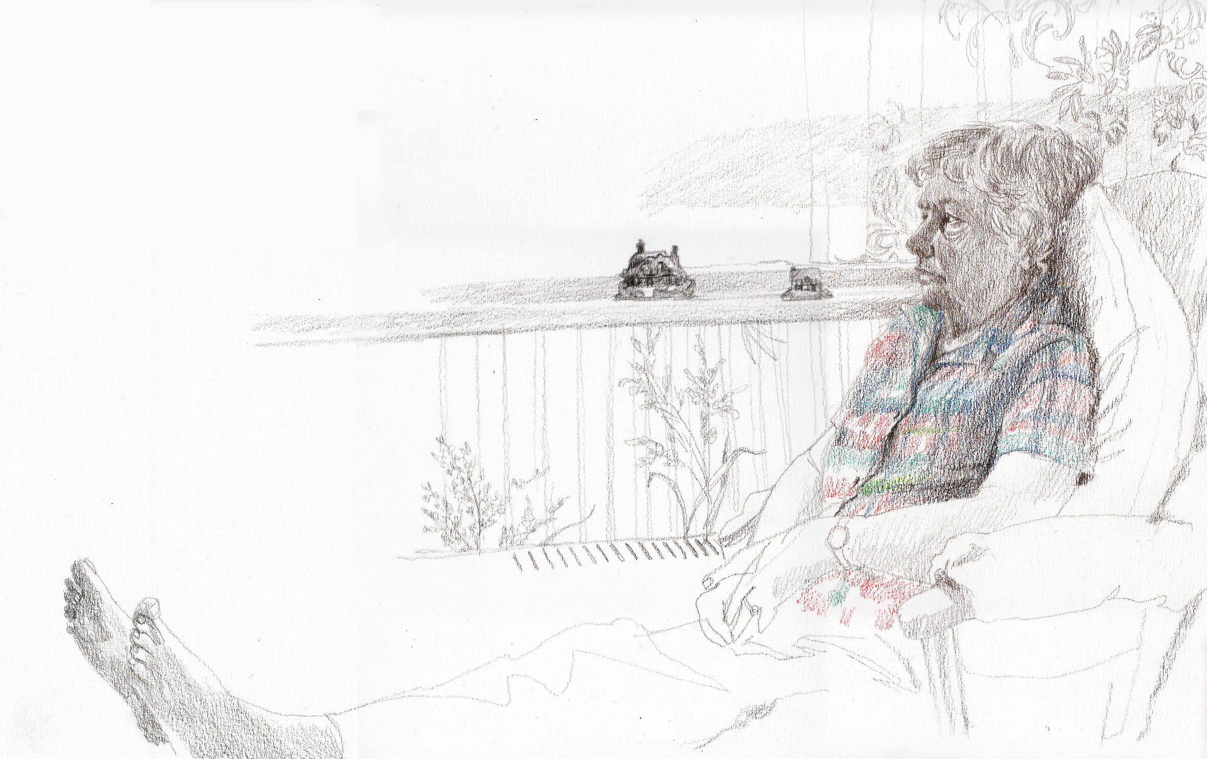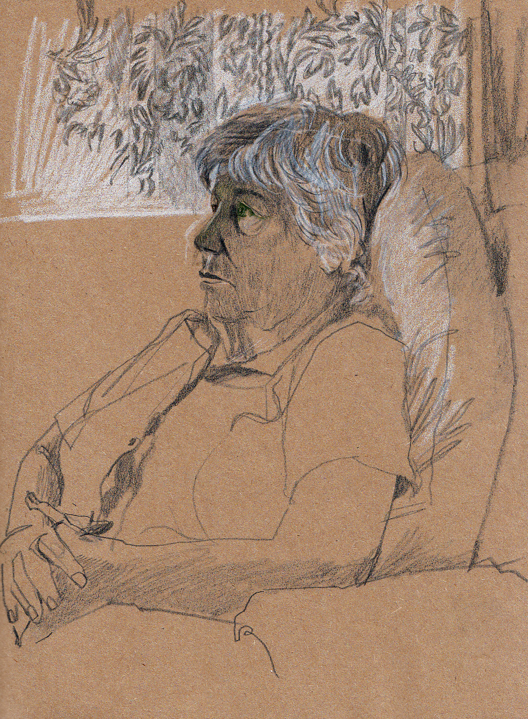 This is my aunt watching telly. I’d like to learn to paint properly, not that I can’t, just that it’d be good to have a really intensive bit of training in the proper use of oil, with an official portrait painter – I need to look into this, as I am sure there are courses out there. Going to try and branch out into portraits of families etc (not from photos), along with my event illustration business. Both drawn and painted…