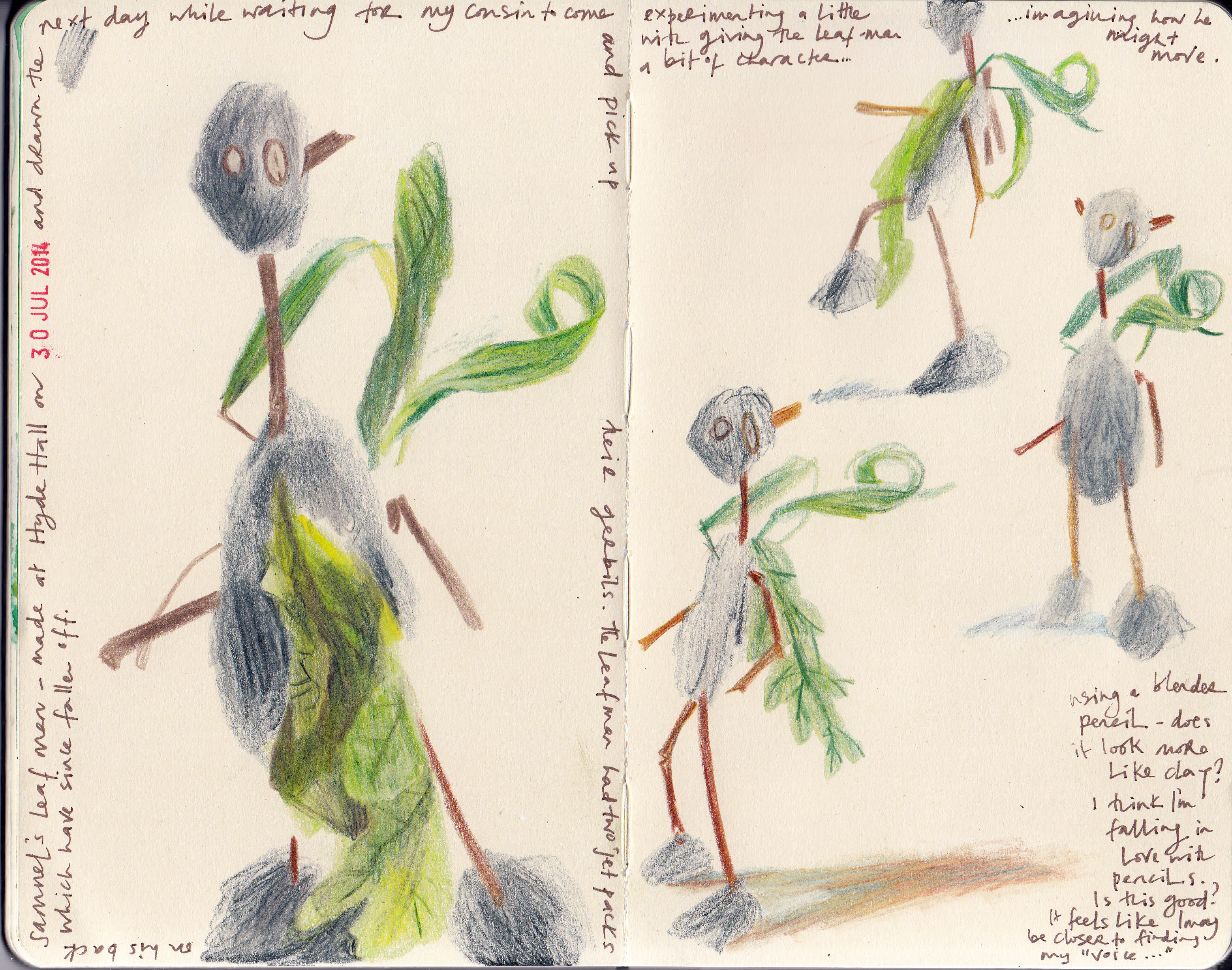 Well, in an attempt to keep updating my blog regularly, or at least a bit more frequently, I’d like to share my latest sketchbook doodle – drawn predominantly ‘from life’, very quickly, with coloured pencils.