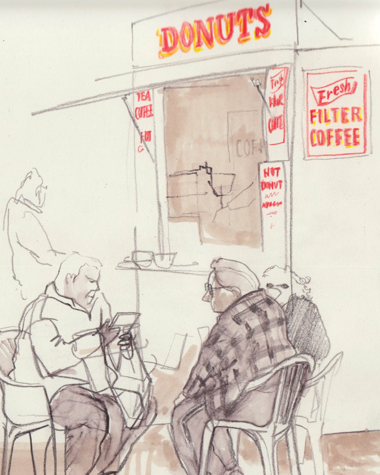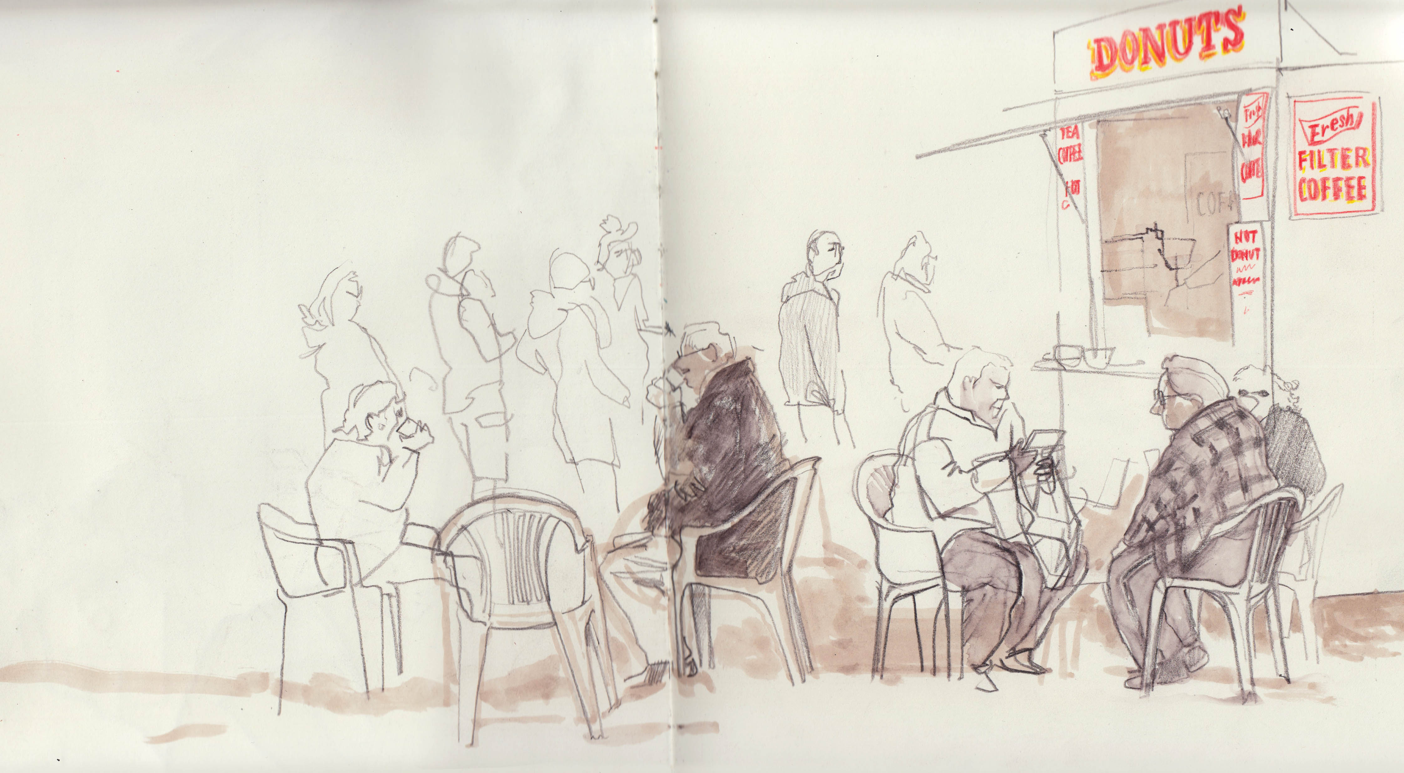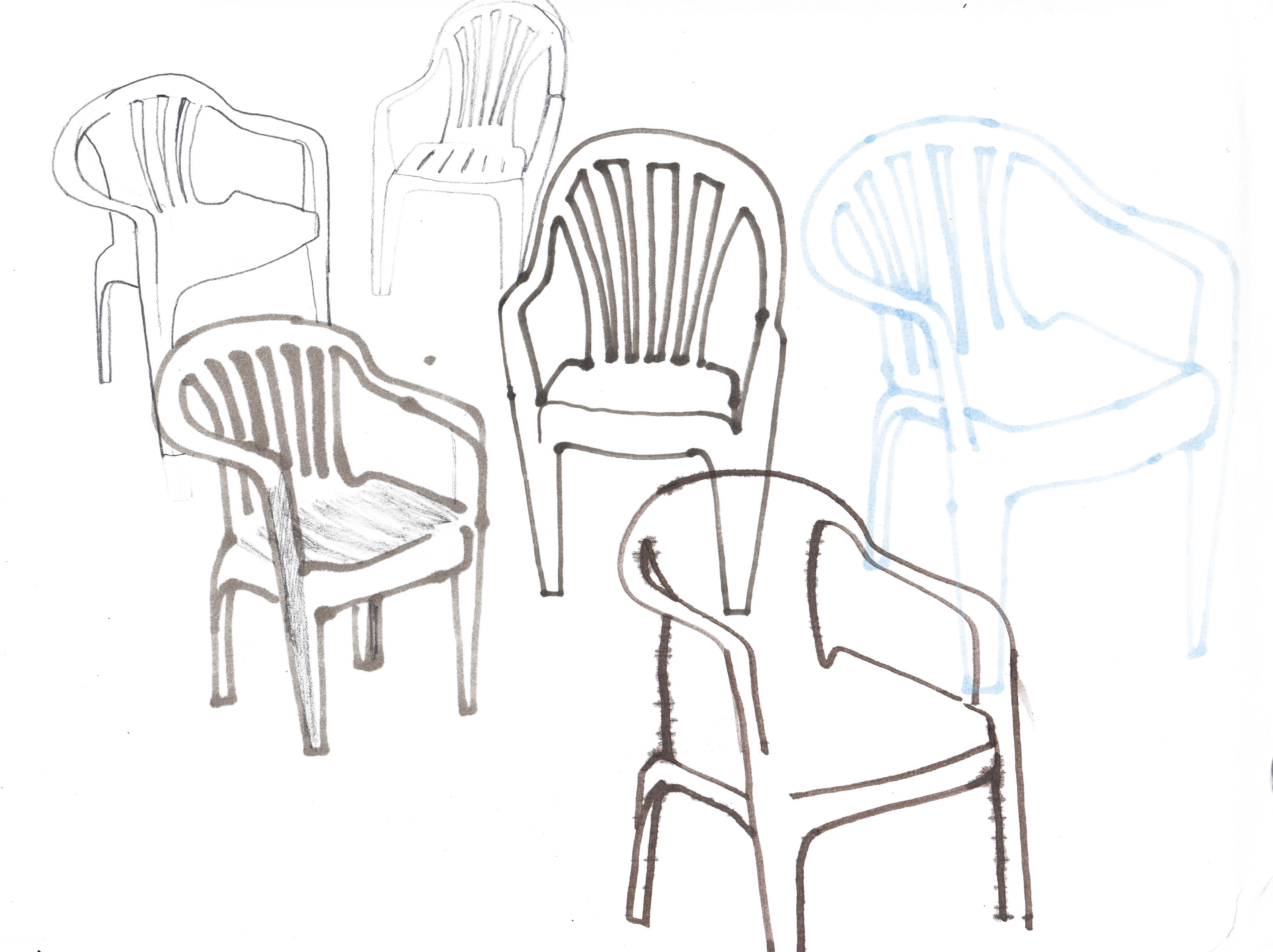 I plan to follow a line of enquiry through drawing. The idea is for it to be a reportage project, an exploration, at least on the surface, into the kinds of places that you find these white plastic chairs. Which, incidentally, happen to be rather challenging to draw (this is, I am reliably told, due to them having compound curves). So ostensibly an observational project into the locations of wipe-clean, stackable, moulded, compound-curved plastic chairs. On another level, I sort of hope it might be about the current government’s rhetoric around ‘the deserving vs the undeserving poor’, ‘the hardworking families’ codswallop the mass-media keep bashing on about. So – as I said, I’ve no idea what might come out of it. It’s just nice to have some sort of theme to explore and It might just end up being an interesting series of drawings, which will be fine. I’m looking forward to hanging out in some great seaside locations, a few roadside burger vans and a boot sale or two.
