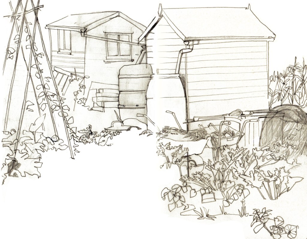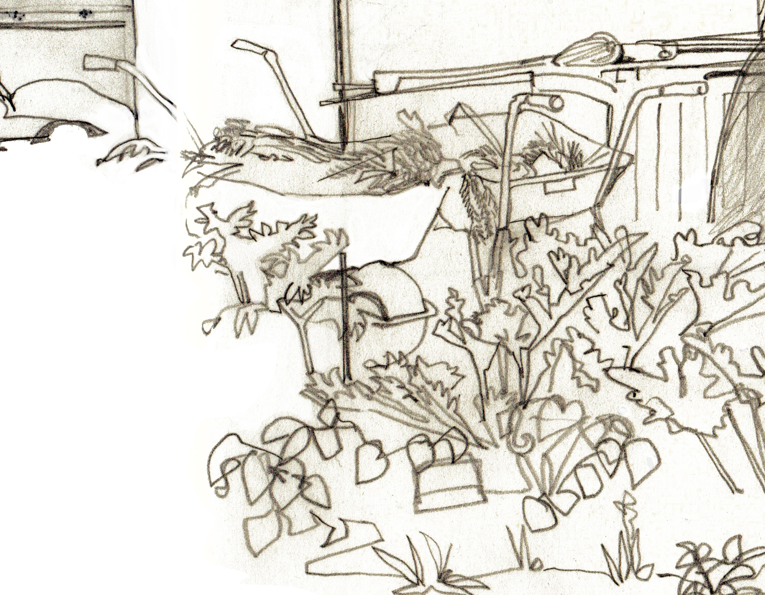 A sketchbook sketch, taken out of the sketchbook. I was struggling with the complexity of the scene but I used a combination of ‘blind’ contour drawing and using a slightly blunter pencil than usual. It seemed to work.