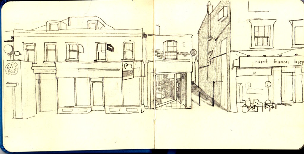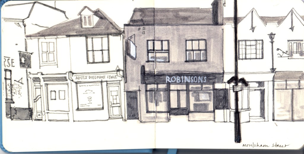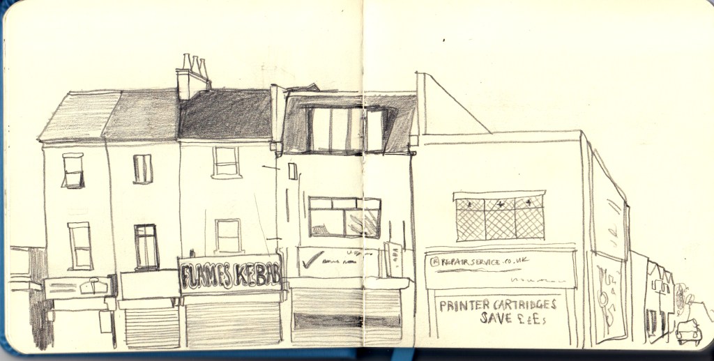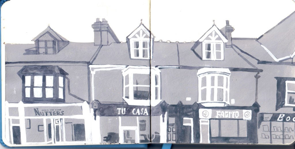 I’m working on a lovely project, obviously connected to ‘The High Street’. Here I am sharing some of my sketchbook research. I’ve gone from avoiding drawing architecture to making it a focal point of my work…